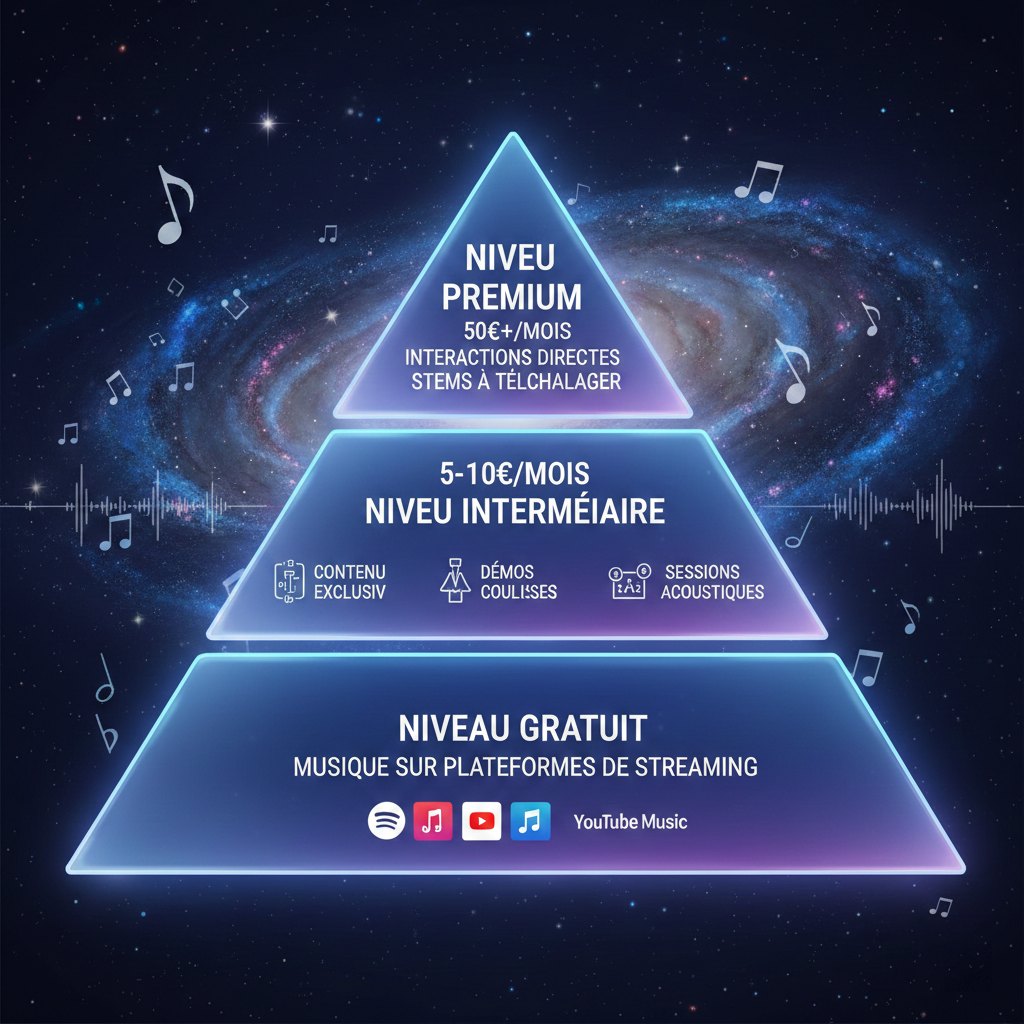 Une pyramide simple qui fonctionne : un premier niveau gratuit avec votre musique sur les plateformes de streaming, un niveau intermédiaire autour de 5 à 10€ par mois donnant accès à du contenu exclusif (démos, coulisses, sessions acoustiques), et un niveau premium à 50€ ou plus pour des interactions directes, des masterclasses ou des stems à télécharger.